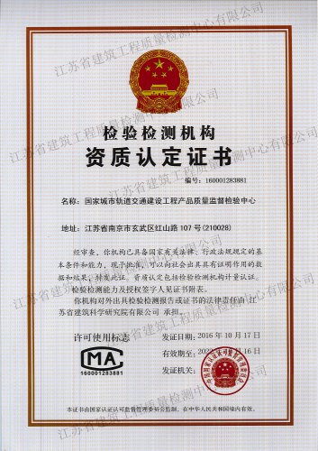 國家城市軌道交通建設(shè)工程產(chǎn)品質(zhì)量監(jiān)督檢驗(yàn)中心, 依托江蘇省建筑科學(xué)研究院和江蘇省建筑工程質(zhì)量檢測(cè)中心在城市軌道交通建設(shè)工程領(lǐng)域的綜合技術(shù)優(yōu)勢(shì),于2016年10月獲得國家認(rèn)證認(rèn)可監(jiān)督委員會(huì)批準(zhǔn)授權(quán)..